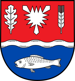 Blasonierung: „Durch einen silbernen Wellenbalken von Rot und Blau geteilt. Oben das silberne holsteinische Nesselblatt, begleitet rechts von einem silbernen Eichenblatt, links von einer silbernen Ähre; unten ein silberner Fisch.“