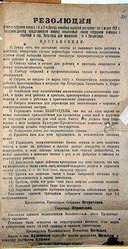 Am 22. Januar 1921 kürzten die Bolschewiki die in Sowjetrussland vorgeschriebene Brotration per Dekret um ein Drittel. Dieses Dekret löste in den folgenden Wochen Unzufriedenheit und ernsthafte Proteste in den großen Städten der RSFSR aus. Am 23. Februar 1921 begannen etwa 10.000 Mitglieder der Parteien der Sozialrevolutionäre und Menschewiki in Moskau einen Streik, dem sich Arbeiter der dortigen Stahlwerke anschlossen. Am 24. Februar 1921 begannen in Petrograd Streiks in den Patronny-Munitionswerkstätten, den Trubotschny- und Baltiskiwerken und der Fabrik Laferme. Am selben Tage wurden vom Petrograder Verteidigungskomitee der KPR(B) Kursanten zur Wassiljewski-Insel befohlen, um die dort versammelten Arbeiter auseinanderzutreiben. Am 25. Februar schlossen sich Arbeiter der Admiralitätswerkstätten und der Galernaja-Docks dem Protest an. Eine Straßendemonstration Streikender wurde von bewaffneten Einheiten verhindert.