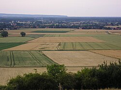 Blick auf das Lübbecker Lößland vom Wiehengebirge. Im Hintergrund die Ortschaft Blasheim markiert in etwa die Nordgrenze des Lößlandes. Am Horizont der Stemweder Berg