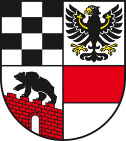 ![]() | Blasonierung: „Geviert; Feld 1: schwarz-silbern geschacht, Feld 2: in Silber ein schwarzer goldbewehrter Adler, die Sachsen mit goldenen Kleestängeln belegt, Feld 3: in Silber ein schreitender schwarzer Bär auf roter, schwarz gefugter, schräg aufsteigender Zinnenmauer mit offenem Tor, Feld 4: Rot über Silber geteilt.“ |