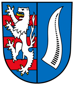 Blasonierung: „Gespalten, vorne in Blau und Rot geteilt, darauf ein silberner Löwe mit goldener Bewehrung, hinten in Blau ein aufgerichtetes silbernes Horn.“