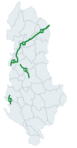 | Durrës | Kakavija / GR | Rrogozhina – Lushnja – Fier – Tepelena – Gjirokastra | 225,1 km (neue Strecke über Levan) 223,3 km (alte Strecke über Ballsh) | fertig | ||