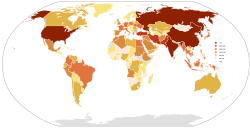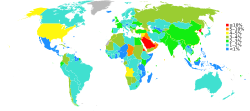 Weltkarte, eingefärbt nach Militärausgaben in Prozent des BIP (Stand 2012)