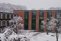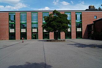 Westseite des Ludwigs­gymnasiums im Winter 2018, links daneben die Mensa
