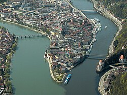 Zusammenfluss von Inn (links) Donau (rechts) und Ilz (ganz rechts unten) bei Passau…