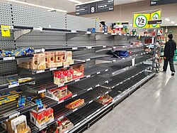 Die Regale der Supermärkte, die Trockenteigwaren führen, sind wegen der Panikkäufe infolge des Ausbruchs des Coronavirus COVID-19 fast leer. Diese Aufnahme wurde 2020 in einem Woolworths-Supermarkt in Melbourne, Australien, gemacht.