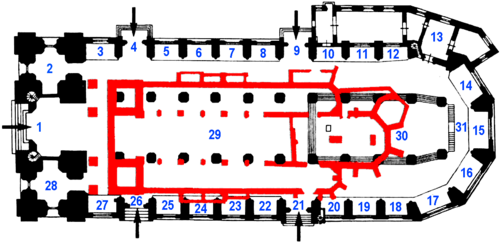 Das Mittelschiff hatte eine Breite von 10,20 m und war von einem Kreuzgratgewölbe überspannt. Die Obergaden des Mittelschiffs ruhten auf Pfeilern, die abwechselnd einen rechteckigen und einen kreuzförmigen Querschnitt hatten. Beidseitig des Mittelschiffs schlossen sich die Seitenschiffe mit einer Breite von 5,70 m an.