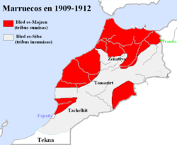 Machtbereich des marokkanischen Sultans (bilad al-maghzen) in rot. Die Gebiete nicht unterworfener Stämme (bilad al-siba) in grau. Letztere erkannten vielfach seine Oberhoheit als religiöser Führer an.