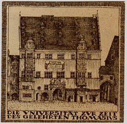 Die Universität zur Zeit des Thomasius auf einem Notgeldschein von 1921.