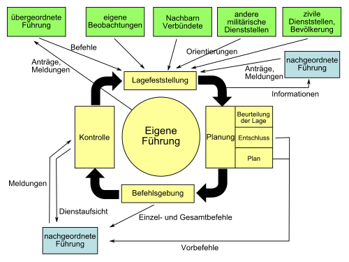 die als Regelkreislauf ablaufen. Sie bauen aufeinander auf und ermöglichen folgerichtiges Denken und Handeln. Engmaschig miteinander verwoben, wiederholen und ergänzen sie sich. Ständige Lagefeststellung erkennt Veränderungen und beurteilt sie. Die Beurteilung dient der Entscheidungsvorbereitung und Planung von Handlungsalternativen, die im Entschluss münden. Der Entschluss ist Kernstück der anschließenden Befehlsgebung, bei der auch das Zusammenwirken der unterstellten und auf Zusammenarbeit angewiesenen (aZa) Truppen koordiniert wird. Schon während der Entscheidungsvorbereitung können diese durch Vorbefehle orientiert und frühzeitig auf neue Aufträge vorbereitet werden. Mit der Kontrolle, die jeder Befehlsgebung folgt, schließt sich der Regelkreislauf, da die im Rahmen der Kontrolle gewonnenen Erkenntnisse wieder in die Lagefeststellung einfließen, um erneut beurteilt zu werden.