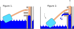 Simples Beispiel für eine negative Rückkopplung in der Technik. Die Entleerung eine WC-Spülkastens bewirkt über einen an einem Hebel befestigten "Schwimmer", dass der Wasserzulauf geöffnet wird. Wenn der Spülkasten bis oben gefüllt ist, wird der Wasserzulauf wieder geschlossen.