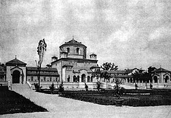 Gesamtansicht des Friedhofsgebäudes (Leichenhauses) gegen das Gräberfeld (1901)