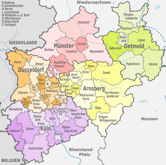 | Arnsberg | Bochum, Dortmund, Ennepe-Ruhr-Kreis, Hagen, Hamm, Herne, Hochsauerlandkreis, Märkischer Kreis, Olpe, Siegen-Wittgenstein, Soest, Unna | 3.597.297 | 8011 | 449 |