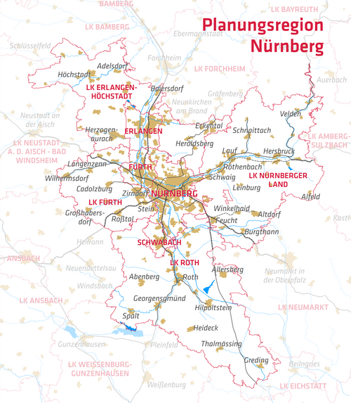 | Nürnberg-Stadt | Fürth-Stadt | Erlangen-Stadt | Schwabach-Stadt | Nürnberger Land | Fürth-Land | Erlangen-Höchstadt | Roth | Region Nürnberg | |