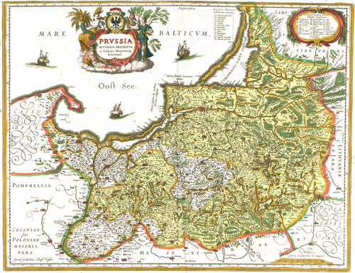 Preußen 1576 (C. Henneberg, nachgedruckt 1645 von Blaeu): Herzogliches Preußen nachträglich farbig unterlegt, Königliches Preußen nicht
