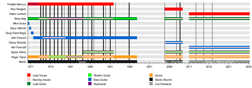 Queen ist eine 1970 gegründete britische Rockband. Ihre Besetzung mit Freddie Mercury, Brian May, Roger Taylor und John Deacon blieb zwei Jahrzehnte lang unverä