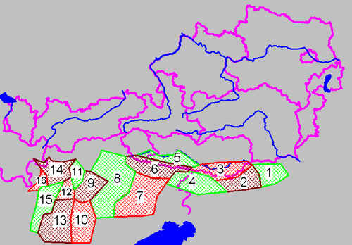 | Die hier markierten Gruppen 1. Bachergebirge, 14. Ortler-Alpen, und 16. Sobretta-Gavia-Gruppe zählen (fast nur) zum kristallin-schiefrigen zentralen Teil der Alpen (Zentralalpen) | |