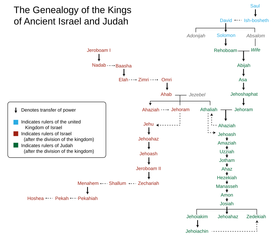 Er wurde von David aus dem Stamm Juda abgelöst. David, zunächst ein Söldner- oder Räuberführer teils in Opposition, teils als Auftragnehmer und Vasall der Philister, soll um das Jahr 1004 v. Chr. zunächst in Hebron zum König über den Stamm Juda gesalbt worden sein (2 Sam 2 EU), dann in Juda (dem späteren Südreich) ein lokales Königtum errichtet haben. Laut biblischem Zeugnis gelang es ihm dann, die jebusitische Stadt Jerusalem zu erobern und von dort aus zum König auch über das nördlich gelegene Israel aufzusteigen. Gemäß der Großreichs-Hypothese konnte er seine Machtbasis ausbauen, die Philister dauerhaft zurückdrängen, einen Staat strukturieren und eine Dynastie begründen. Unter David gewann der Staat seine größte Ausdehnung. Unter seinen Söhnen gab es heftige Rivalitäten um die Nachfolge. Schließlich setzte sich Salomo (1 Kön 1 EU) durch. Salomo regierte ungefähr ab 965, konnte das Land wirtschaftlich aufbauen und festigte die Bedeutung Jerusalems durch den Bau des sogenannten ersten Tempels nach phönizischem Vorbild mit der Hilfe Hirams von Tyros. Unter Salomo gab es Frondienste und hohe Abgaben zum Bau von Palast und Tempel, was Unzufriedenheit mit sich brachte.
