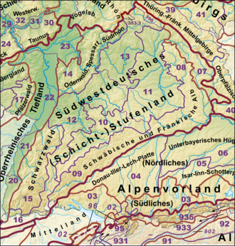 Es folgt die Aufgliederung des Südwestdeutschen Stufenlands in Haupteinheitengruppen (zweistellig) und Haupteinheiten (dreistellig):