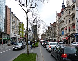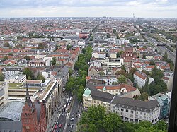 | Blick vom Steglitzer Kreisel Richtung Nordost in die Schloßstraße. Links unten das Rathaus Steglitz | ||