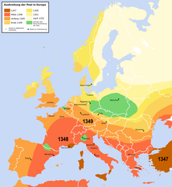 Im Gebiet des heutigen Deutschlands, in Norwegen (siehe Pestepidemien in Norwegen), Schweden, England und Irland trat die Seuche erstmals im Jahr 1349 auf.