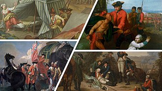 Gemälde aus der zweiten Hälfte des 18. Jahrhunderts (im Uhrzeigersinn, beginnend oben links): Schlacht bei Hochkirch, Schlacht am Lake George, Schlacht bei Prag, Schlacht bei Plassey.