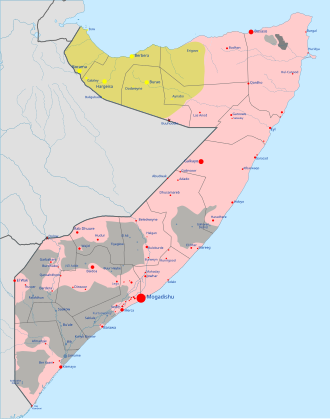 Von al-Shabaab-Islamisten kontrolliertDer Bürgerkrieg begann mit dem bewaffneten Widerstand diverser Akteure gegen die Herrschaft des Diktators Siad Barre und erreichte seinen Höhepunkt nach dem Sturz Barres 1991. Seither existiert in Somalia keine wirksam funktionierende Zentralregierung mehr und Somalia ist ein gescheiterter Staat. Die politische Entwicklung verlief in verschiedenen Landesteilen unterschiedlich: Im Nordwesten des Landes hat sich 1991 der unabhängige De-facto-Staat Somaliland gebildet, der bis heute weitgehend stabil existiert. Auch das angrenzende Puntland blieb lange weitgehend autonom. Die Hauptstadt Mogadischu war und ist hingegen umkämpft. Auch Südwestsomalia und Jubaland waren Schauplatz vieler Kampfhandlungen.