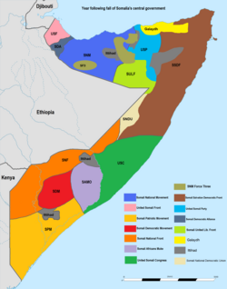 Die verschiedenen Bewegungen gegen Barre hatten sich im Vorfeld darauf verständigt, gemeinsam eine neue Regierung zu bilden. Dies scheiterte jedoch, als der von den Hawiya Mohammed Farah Aidid und Ali Mahdi Mohammed geführte USC den Sieg über Barre und damit den Hauptteil der Macht für sich allein beanspruchte. Die anderen Oppositionsgruppen erkannten die vom USC gebildete provisorische Regierung nicht an. Der Norden des Landes erklärte unter der Führung der SNM als Somaliland einseitig seine – international nicht anerkannte – Unabhängigkeit. Der USC selbst spaltete sich Ende 1991 zwischen den Unterclans der Abgal- und Habar-Gedir-Hawiya, als sich Ali Mahdi Mohammed (Abgal) in Mogadischu zum Präsidenten ausrief, während Aidid (Habar Gedir) Siad Barre verfolgte. Abgal- und Habar-Gedir-Milizen lieferten sich in der Folge schwere Kämpfe in Mogadischu, bei denen massive Zerstörungen angerichtet und schätzungsweise 14.000 Menschen getötet wurden. Derweil formierten sich zu Siad Barre loyale Darod in dessen Heimatregion Gedo im Jubba-Tal, um unter Führung von Barres Verteidigungsminister und Schwiegersohn Siad Hersi „Morgan“ für eine Rückkehr Barres zu kämpfen. Somalia zerfiel in umkämpfte Machtbereiche von Clans und Warlords und deren Milizen. So wird auch 1991 vielfach als Jahr des Kriegsbeginns angegeben.