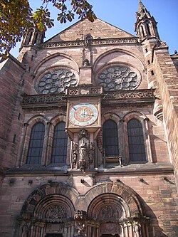 Um 1225–1230 kam eine Bildhauerwerkstatt nach Straßburg, um das bestehende, noch romanische Doppelportal und seine zwei Tympanonfelder mit Reliefs und Gewändefiguren auszustatten. Die Apostelstatuen des Figurengewändes wurden in der französischen Revolution zerstört, die Mittelfigur des Salomo und die Türstürze mit Reliefs der Grabtragung und Himmelfahrt Mariens erlitten das gleiche Schicksal, wurden aber im 19. Jahrhundert durch freie Nachschöpfungen ersetzt. Die Originale der Statuen von Ecclesia und Synagoge sind am Portal durch Kopien ersetzt, die Originale stehen im Frauenhausmuseum. Die Tympana zeigen mit Marientod und Krönung Marias noch den originalen Zustand. Die Madonna unter der Uhr ist eine freie Erfindung des 19. Jahrhunderts.