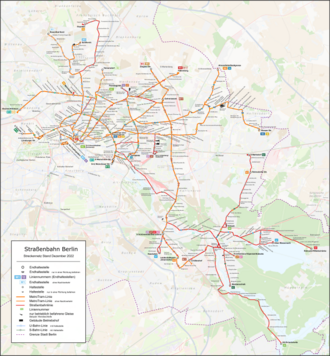 Die Berliner Straßenbahn ist eines der ältesten und größten Straßenbahnnetze der Welt. Betreiber sind die 1929 gegründeten Berliner Verkehrsbetriebe (BVG). Das normalspurige Netz hat eine Streckenlänge von 193,6 km und 814 Richtungshaltestellen. Die Fahrdrahtspannung der Oberleitung beträgt seit Anfang April 2023 750 V. 22 Linien bilden ein Streckennetz von einer Länge von ca. 200 km sowie ein Liniennetz von 314,2 km. Im Jahr 2022 beförderte die Berliner Straßenbahn 131,8 Millionen Fahrgäste.