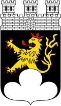 Blasonierung: „In Schwarz ein aus einem silbernen (weißen) Dreiberg wachsender rot gekrönter und bewehrter goldener (gelber) Löwe; im Oberwappen eine dreitürmige gezinnte silberne (weiße) Mauerkrone, mit geschlossenem Tor.“