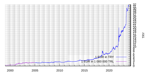 Zum 1. Januar 2005 führte die Türkische Republik einen Währungsschnitt durch, 1.000.000 alte Lira (ISO-Code TRL) wurden gegen eine neue Lira (ISO-Code TRY) getauscht. Übergangsweise bis 31. Dezember 2005 wurden die alten Banknoten als Zahlungsmittel akzeptiert, die über 20 Jahre zuvor aus dem Verkehr gezogenen Kuruş wurden wieder eingeführt (100 Kuruş = 1 neue Lira). Zum 1. Januar 2009 entfiel wieder das Attribut Neue und nochmals neues Bargeld ohne dieses Attribut wurde in Umlauf gebracht. Die neuen Scheine sind wesentlich fälschungssicherer als die alten. Im täglichen Gebrauch ist bis heute häufig die Abkürzung YTL (statt TRY) anzutreffen.