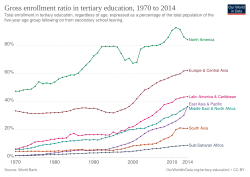 Der Bevölkerungsanteil mit Abschluss im tertiären Bildungsbereich nimmt in allen Teilen der Welt seit Jahrzehnten zu. Während der Anteil in der westlichen Welt seit 1970 um die Hälfte anstieg oder sich verdoppelte, vervielfachte er sich in weniger entwickelten Ländern, dort allerdings auf niedrigerem Niveau.
