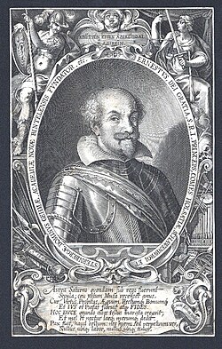 Graf Ernst (1569–1622), Gründer der Universität, Stich von Lucas Kilian (1623)