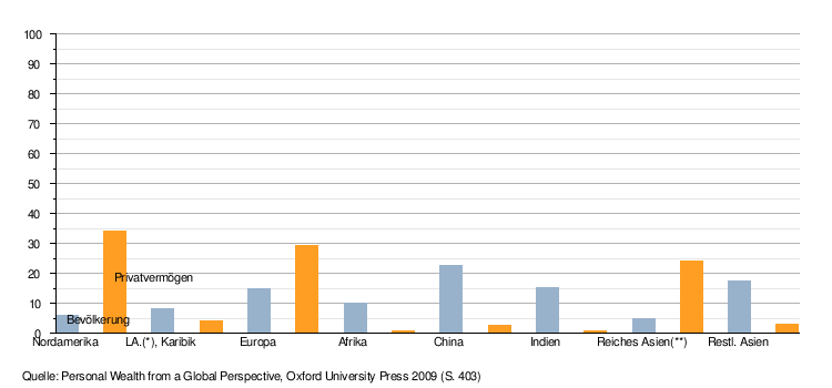 Anteile verschiedener Gebiete an der Weltbevölkerung und am globalen privaten Vermögen im Jahr 2009 (in Prozent)