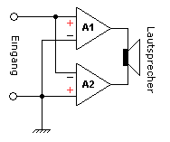 - Gegentaktverstärker Klasse A: Es gibt zwei aktive Bauelemente, beide leiten immer. Anwendung in transformatorlosen Leistungsverstärkern. Maximaler theoretischer Wirkungsgrad bei Vollaussteuerung ist 50 %.