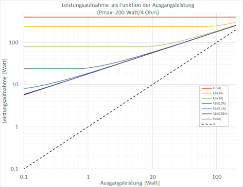 - Gegentaktverstärker Klasse AB: zwei aktive Bauelemente arbeiten in einer Gegentaktschaltung abwechselnd (engl. push-pull). Theoretischer Wirkungsgrad bei Vollaussteuerung: 50 % … 78,5 %.