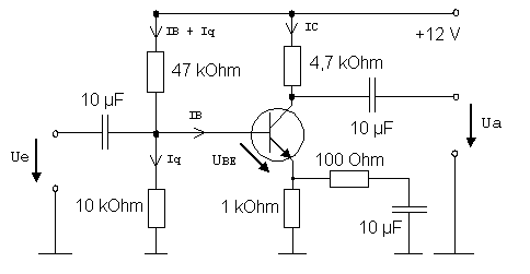 Die Verstärkung eines Transistors ist in Emitterschaltung besonders groß und – wenn keine hohe Leistung gefordert wird – genügt bei A-Betrieb ein Kollektorstrom von um 1 mA. Mit einer Stromgegenkopplung kann man erreichen, dass der gewählte Arbeitspunkt auch bei Exemplarstreuungen der Transistorparameter eingehalten wird und fast temperaturunabhängig ist. Dazu soll der Spannungsabfall am 1-kΩ-Widerstand zwischen Emitter und Masse (das sind die untersten Symbole, die an 0 V angeschlossen werden) etwa 1 V betragen, denn UBE kann – abhängig von Exemplar und Temperatur – um etwa 0,06 V schwanken.