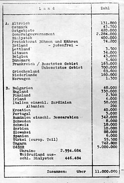 Eichmann ließ am 7. und 13. August 1941 die Reichsvereinigung der Juden in Deutschland auffordern, statistische Angaben über die Juden in Europa zu liefern. Sein Referat IV B 4 glich diese Zahlen mit Angaben der Besatzungsbehörden ab und subtrahierte bereits die Opfer des Holocaust in Litauen, Lettland und Estland, das als „judenfrei“ bezeichnet wird. Die offensichtlich überhöhte Zahl für den unbesetzten Teil Frankreichs, die zu Spekulationen über die Einbeziehung der Juden Nordafrikas in die Vernichtungspläne führte, wird von Dan Michman als Schreibfehler erklärt;Ahlrich Meyer führt sie auf einen Schätzwert Theodor Danneckers zurück.
