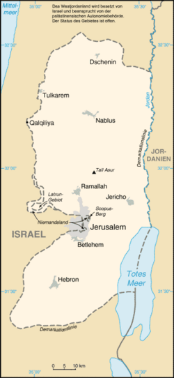 Als Bestandteil des britischen Völkerbundsmandats für Palästina wurde das Westjordanland von der UN-Vollversammlung im Teilungsplan von 1947 dem zu gründenden arabischen Staat zugesprochen. Im Palästinakrieg wurde es 1948 von Jordanien besetzt und 1950 annektiert. Im Sechstagekrieg vom Juni 1967 wurde es von Israel erobert und steht seither unter israelischer Militärverwaltung; Ostjerusalem und Umgebung wurden dagegen von Israel 1980 – laut der Resolution 478 des UN-Sicherheitsrates – völkerrechtswidrig annektiert.