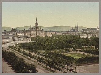 Der heutige Universitätsring mit dem Burgtheater um 1900, im Vordergrund der Rathauspark