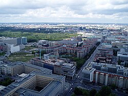 | Blick nach Norden über die Wilhelmstraße, vorn links das Bundesfinanzministerium, im Hintergrund Großer Tiergarten und Bundeskanzleramt | ||