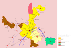 Territorium der Reichsstadt Schweinfurt bis 1802 (dunkelgelb) mit Zell im mittleren Norden