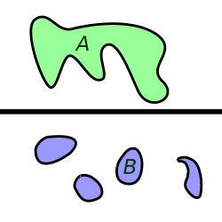 Zusammenhängende und nicht zusammenhängende Unterräume von ℝ² : A ist einfach zusammenhängend, B (das gesamte Blaue) ist unzusammenhängend. Die Komplemente von A und B sind zusammenhängend, aber nicht einfach zusammenhängend.