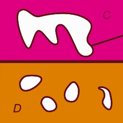 So sind in der nebenstehenden Abbildung sowohl der pinkfarbene Raum C{\displaystyle C}{\displaystyle C} als auch sein weißes Komplement „einfach zusammenhängend“, ersterer allerdings erst dadurch, dass eine Trennlinie die Umrundung des weiß gezeichneten Komplements verhindert. Im unteren Teilbild dagegen sind weder der orangefarbene Raum D{\displaystyle D}{\displaystyle D} noch sein weiß gezeichnetes Komplement „einfach zusammenhängend“ – interpretiert man D{\displaystyle D}{\displaystyle D} als Darstellung der Topologie einer „Kugel mit vier Henkeln“, wären das Komplement die vier „Löcher“ der Henkelkugel.