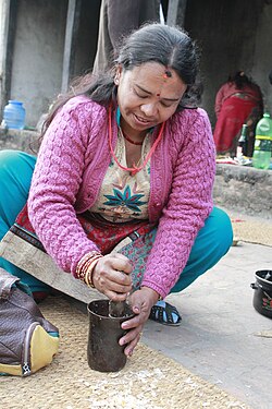 - Zerkleinern von Gemüse: Durch Stampfen wird Maniok nach dem durch Wässern erfolgten Entgiften zu Brei. Das thailändische Gericht Som Tam wird in einem Mörser aus Ton zubereitet.